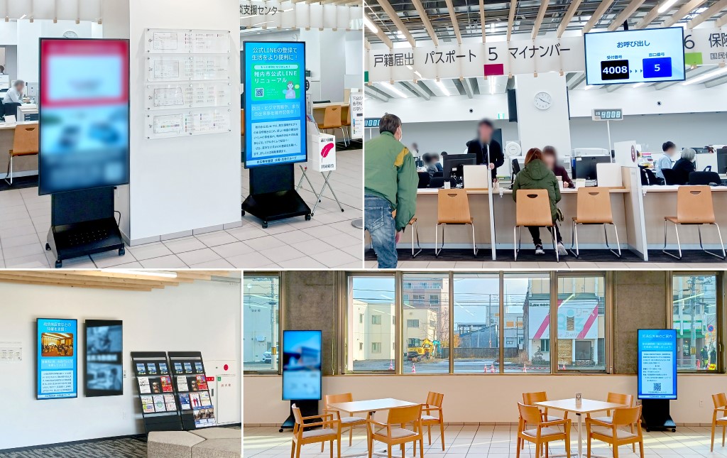 当社が設置したデジタルサイネージは、庁舎内の案内情報や行政からのお知らせを視認性高く分かりやすく発信することを目的としています。これにより、来庁者が必要な情報に迅速にアクセスでき、窓口業務の効率化や来庁時の利便性や満足度の向上に寄与しています。また、当社の広告・番号案内事業との連携により、地域企業や観光情報などの発信も可能となり、庁舎内外での情報流通の活性化にも寄与しています。