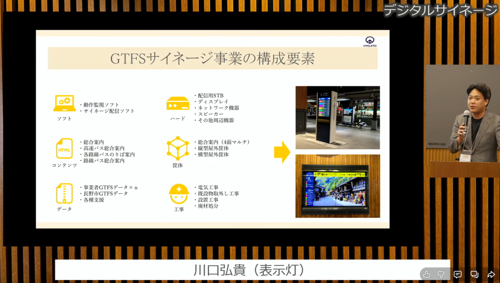 公共交通オープンデータに関わる幅広い取り組みが発表されるなか、川口は「GTFS × デジタルサイネージ事業の推進」をテーマにお話しました。