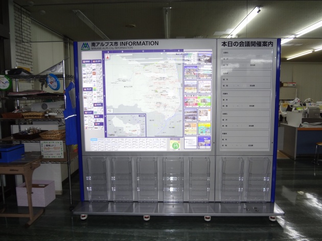 南アルプス市役所 ■サイズ/H.2100×W.2341 ■タイプ/可動式 ■仕様/電照 LED ■コンテンツ/市全図・ホワイトボード・パンフレットラック・モバイル対応(ナビタッチ) ■設置日/2013年8月