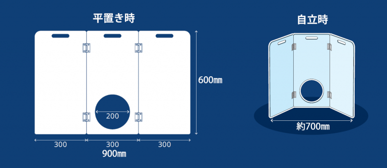 卓上に自立の状態 :高さ 600㎜×横幅 約700㎜ × 厚さ 5㎜